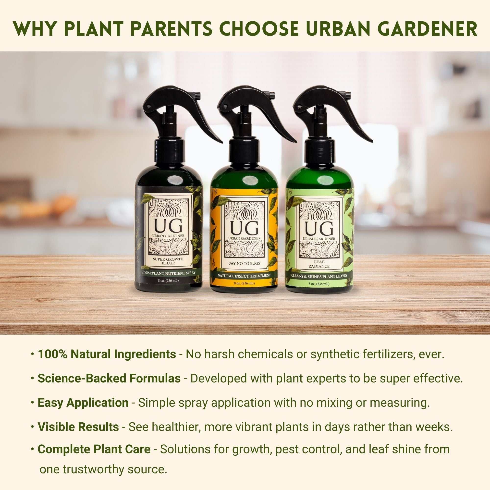 Get the dust and hard water spots off your leaves! Plants hate being covered with grime. Let them get as much sun as possible (and look better than ever) with Leaf Radiance.