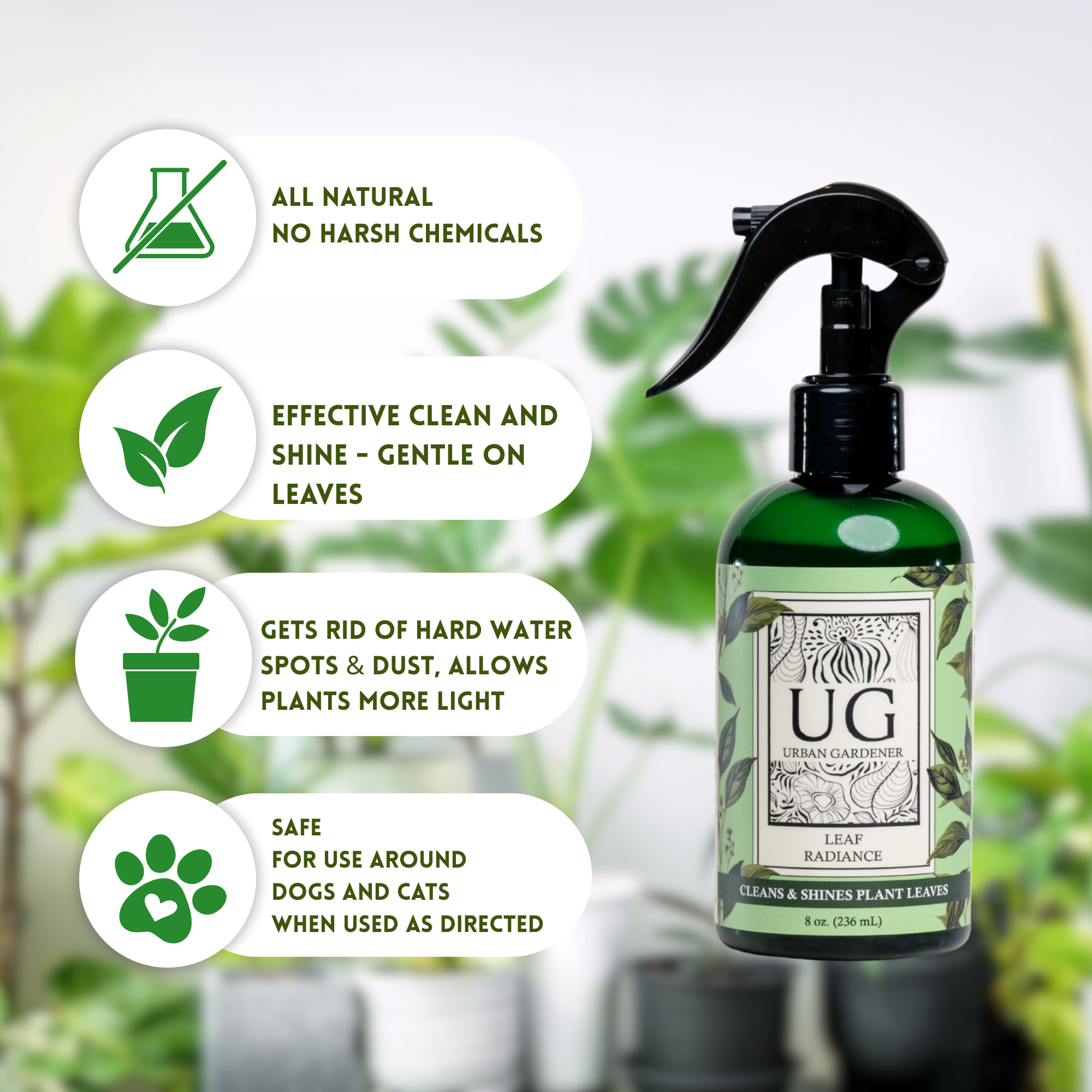 Get the dust and hard water spots off your leaves! Plants hate being covered with grime. Let them get as much sun as possible (and look better than ever) with Leaf Radiance.