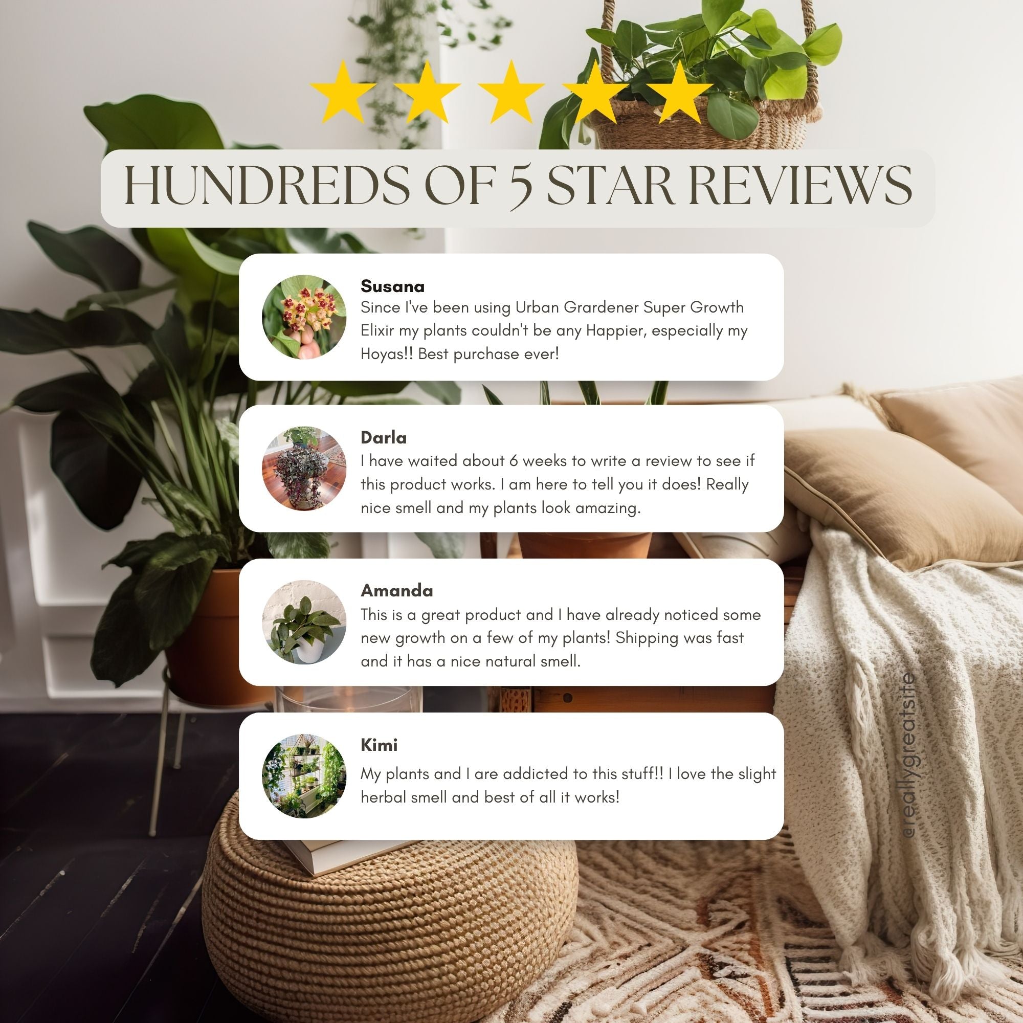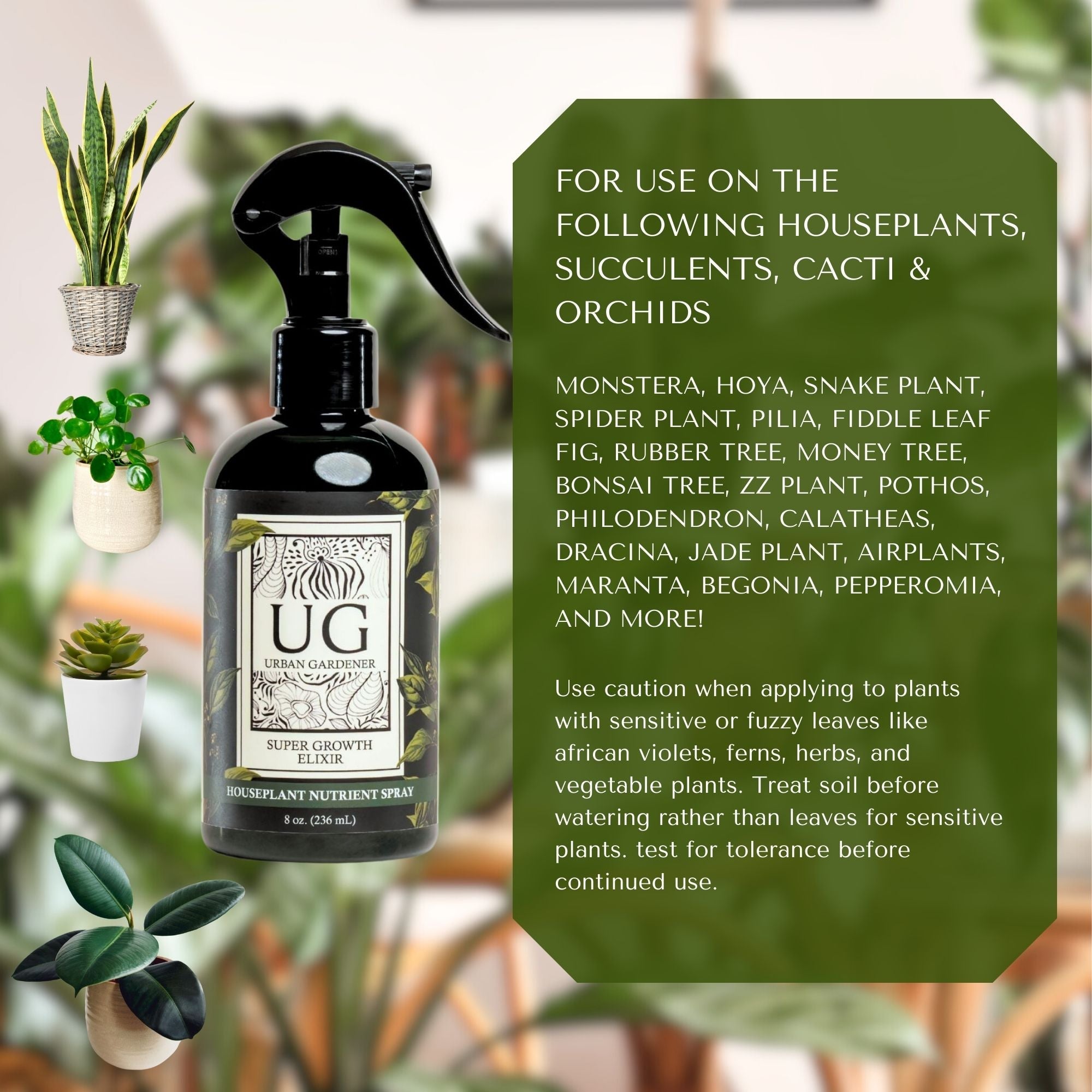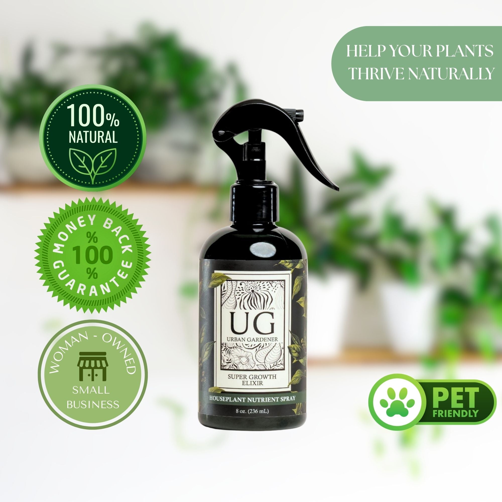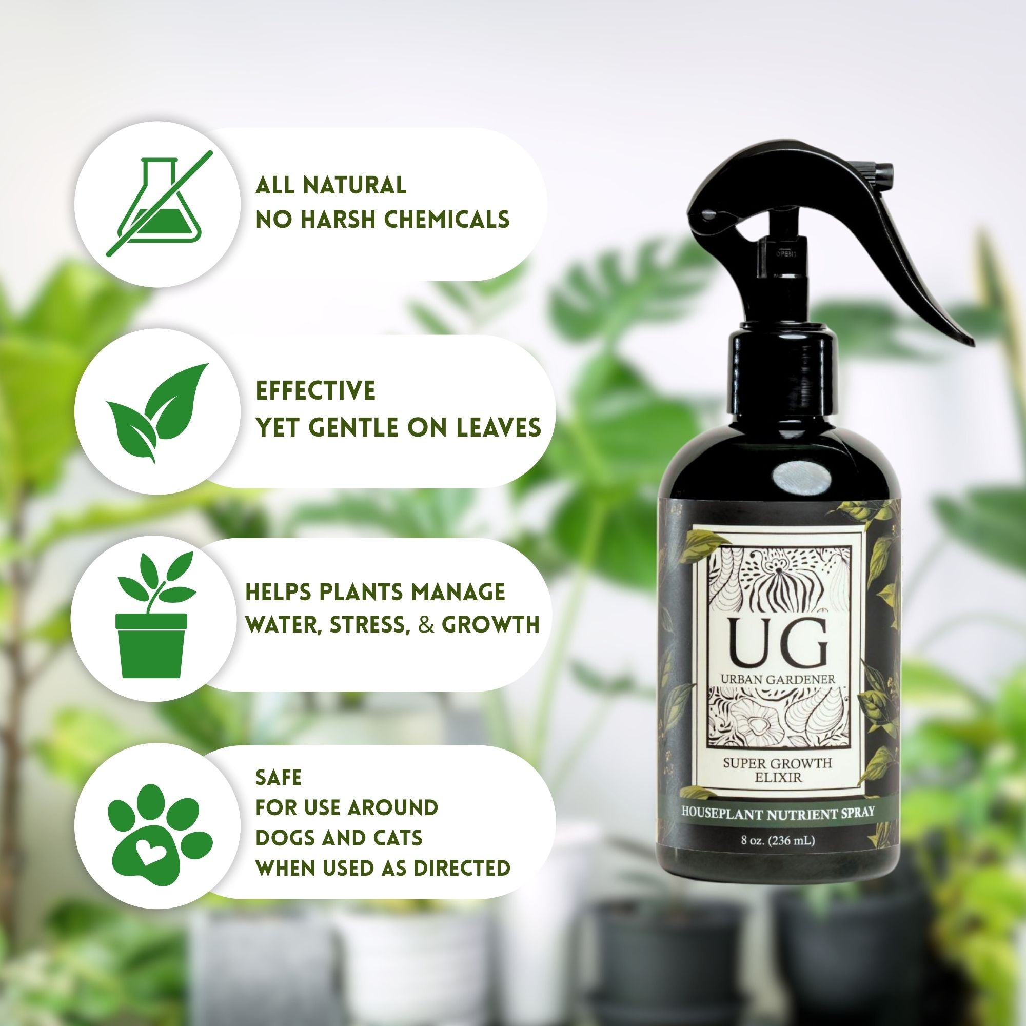 Super Growth Elixir is not simply a fertilizer, plant food, or insect spray but rather an easy-to-use balanced total care solution. Regular use gently coaxes health and brilliance out of even your most finicky plants and is safe to use around kids and pets when used as directed. Prepare to see new leaves sprouting on the happiest versions of your plants.